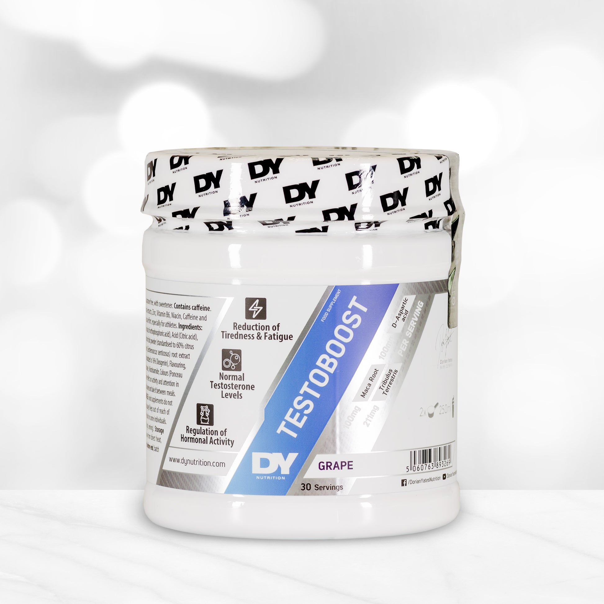 Testoboost metabolic - Aromă de struguri, Extracte botanice, Zinc, Vitamina B6, Niacină, Cofeină și alimente care conțin beta alanină destinate să facă față cheltuielilor de efort muscular intens, în special pentru sportivii cu zaharuri și îndulcitor.